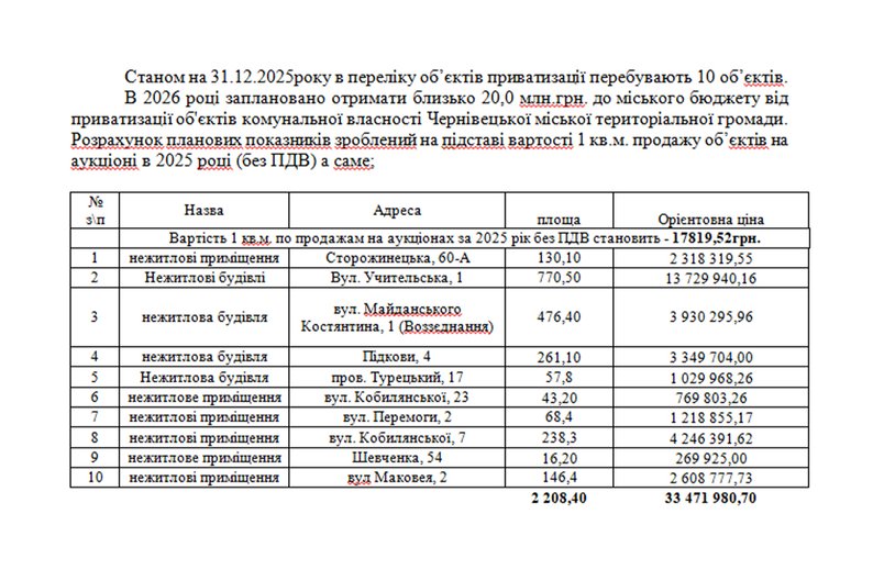 Перелік об’єктів, які попередньо планували виставити на приватизацію у 2026 році в Чернівцях. Скріншот проєкту рішення/Чернівецька міська рада