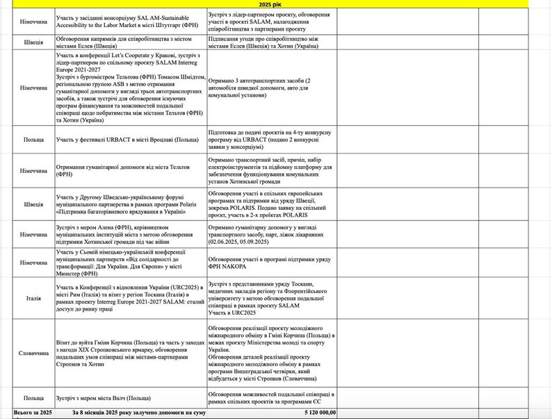 Завдяки відрядженням Дранчука упродовж 2022-2025 років залучили до бюджету громади допомоги на майже 20 мільйонів гривень, йдеться у відповіді на запит. Це зокрема, автомобілі, автобуси, автомобілі швидкої допомоги, трактори, генератори, медикаменти, меблі та обладнання для лікарень, шкіл тощо.