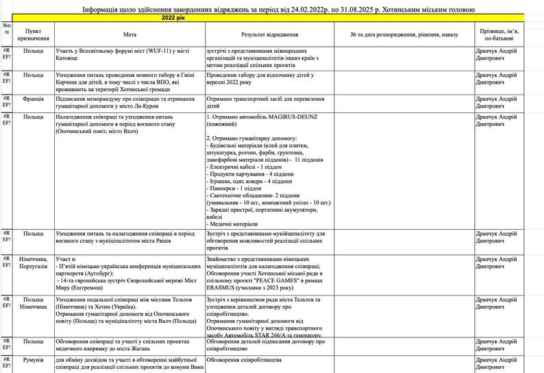 Фрагмент відповіді Хотинської міської ради щодо відряджень Андрія Дранчука у 2022 році. Скріншот відповіді Хотинської міської ради на запит