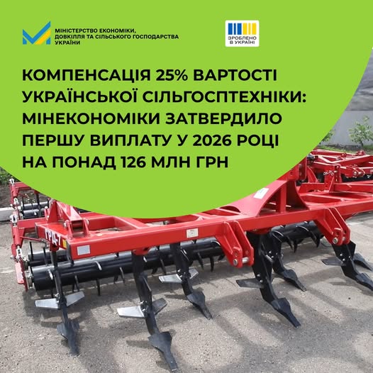 Детальніше – https://www.kmu.gov.ua/news/kompensatsiia-25-vartosti-ukrainskoi-silhosptekhniky-minekonomiky-zatverdylo-pershu-vyplatu-u-2026-rotsi-na-ponad-126-mln-hrn