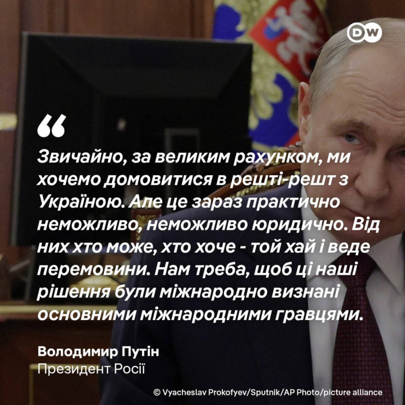 “Звичайно, ми хочемо домовитися в кінцевому підсумку з Україною. Але це зараз просто практично неможливо, неможливо юридично… Від них, хто може, хто хоче, нехай веде переговори. Нам потрібно, щоб наші рішення були визнані основними міжнародними гравцями. Це має значення”, – заявив глава Кремля.