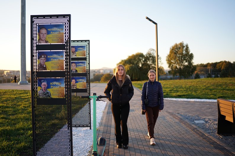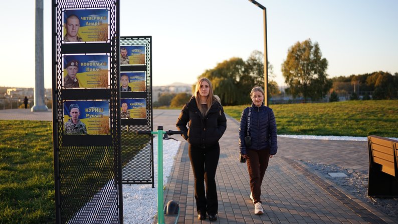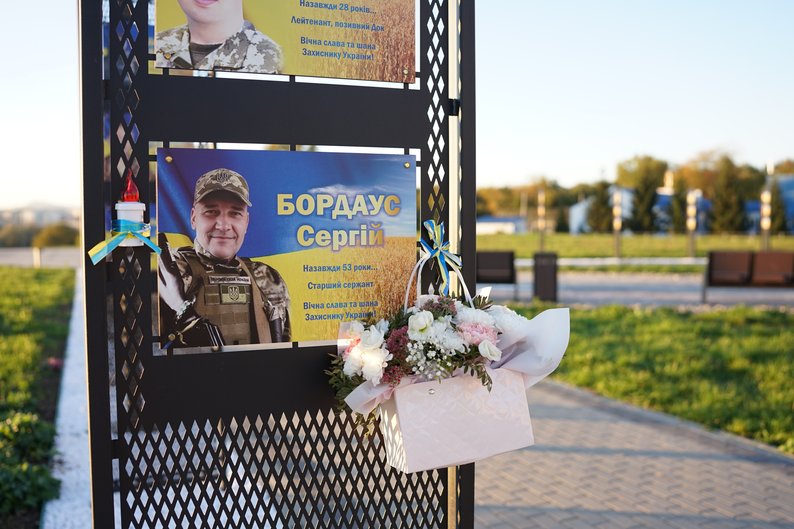 Так вшановують пам'ять про загиблих військових з громади. На стендах — світлини бійців, їхні посади та роки життя. Біля деяких фото прикріплені квіти з жовто-блакитними стрічками.
