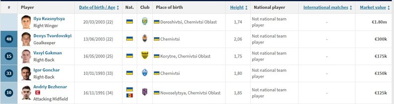 Топ-5 найдорожчих буковинських футболістів. Скріншот з сайту Transfermarkt