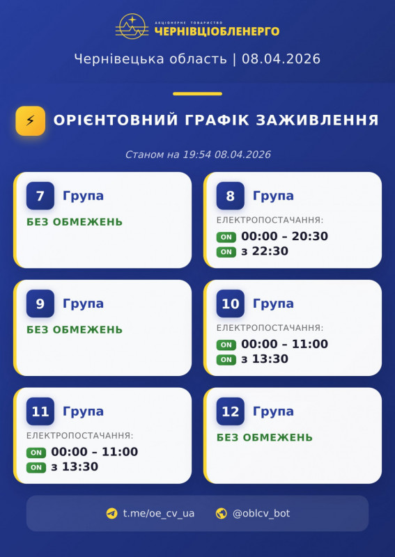 На Буковині 8 квітня відновили графіки обмеження електропостачання через наслідки російських атак на енергетичну інфраструктуру в Україні.