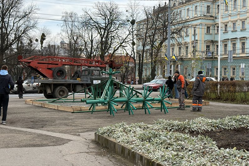 На Соборній площі Чернівців встановлюють новорічну ялинку. На місце привезли металеві конструкції. Ділянку біля скверу Дня Вишиванки перекрили для авто.
