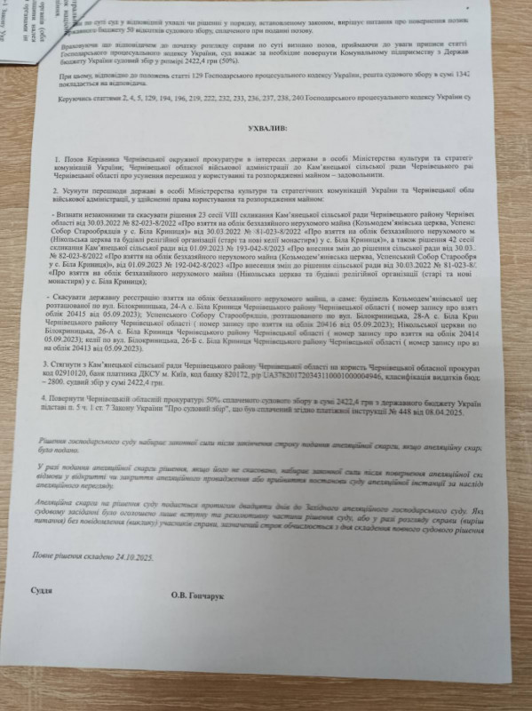 Попри ці обставини Господарський суд Чернівецької області став на бік прокуратури — і 21 жовтня своїм рішенням повернув ситуацію з культовими будівлями у Білій Криниці у безхазяйний хаос (див. прикріплений файл), надзвичайно вигідний тим, хто зацікавлений в їх подальшому грабунку.