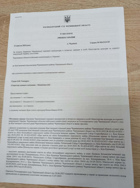 Та сама Чернівецька окружна прокуратура, яка зараз так успішно і наполегливо захищає історичні будівлі у Чернівцях, 4 липня 2025 року подала судовий позов до Кам’янецької сільської ради в інтересах міністерства культури та Чернівецької ОВА з вимогою скасувати як незаконні рішення сільради, ухвалені у 2022 році (!) щодо визнання безхазяйним і взяття на облік громади нерухомого майна комплексу у Білій Криниці. Оскільки, бач, рішення не були погодженні з міністерством культури, і призвели до того, що, на думку прокурорів, майно вибуло (?!) з власності держави поза її волею.