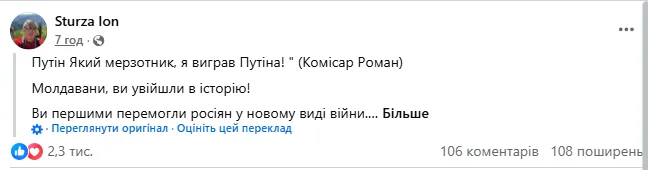 “Молдавани, ви написали історію! Ви перші, хто переміг росіян у війні нового типу”, – прокоментував результати волевиявлення колишній прем’єр-міністр Молдови Іон Стурза.
