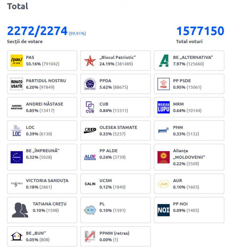 Однак після опрацювання Центральною виборчою комісією протоколів з 99,91% дільниць результати сумнівів не викликають: перемогла партія президентки Санду “Дія і солідарність” (PAS): за неї проголосували 50,16% виборців, що прийшли на виборчі дільниці.