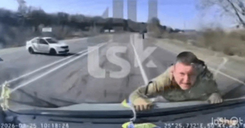 На кадрах видно, як з буса виходять четверо чоловіків у військовій формі і один поліцейський. Один з військових каже, що дає водієві 30 секунд, аби він вийшов «по-доброму». Після паузи водій скористався моментом і дав «по газах», взявши на капот одного з військових ТЦК, що стояв перед авто. Зрештою, проїхавши кількасот метрів, він пригальмував і військовий зліз з капота, а водій поїхав далі.