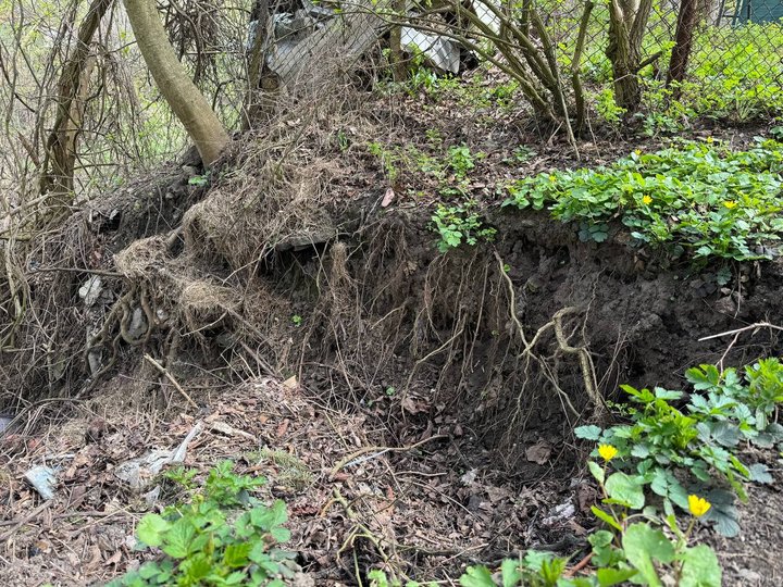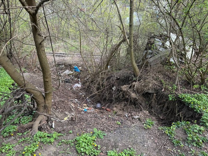 “Потягів було менше. Тепер тут йдуть дуже важкі поїзди, а берег просідає. Торік наш сусід пробував самостійно засипати це урвище. Коли була злива, просто утворився водопад, і все це, що він насипав, за один день забрало. І ще додатково урвало понад півтора метра”, — каже Руслана.
