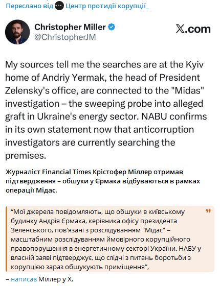 «Мої джерела повідомляють, що обшуки в київському будинку Андрія Єрмака, глави адміністрації президента (України Володимира) Зеленського, пов’язані з розслідуванням «Мідас» – масштабним розслідуванням ймовірних корупційних махінацій в українському енергетичному секторі», – написав Міллер на своїй сторінці в соцмережі Х.