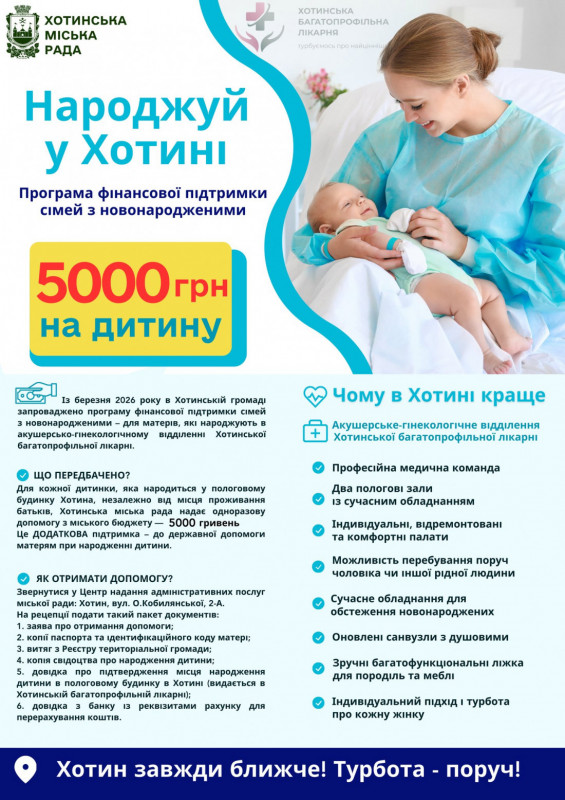 У Хотинській громаді з 1 березня 2026 року запроваджують програму, якою передбачено надання адресної одноразової грошової допомоги з міського бюджету — 5000 грн на кожну дитину, яка народилася у Хотинській багатопрофільній лікарні.