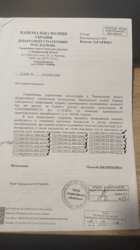 У грудні 2024 року слідче управління ГУ Нацполіції в Чернівецькій області разом з обласним управлінням стратегічних розслідувань відкривають і розслідують проти посадових осіб Кам’янецької сільради кримінальну справу за ознаками зловживання владою, яке, бач, спричинило тяжкі наслідки (див. прикріплений файл). При цьому вони навіть не розуміють, дії якої громади розслідують — Кам’янецької чи Великокучурівської?
