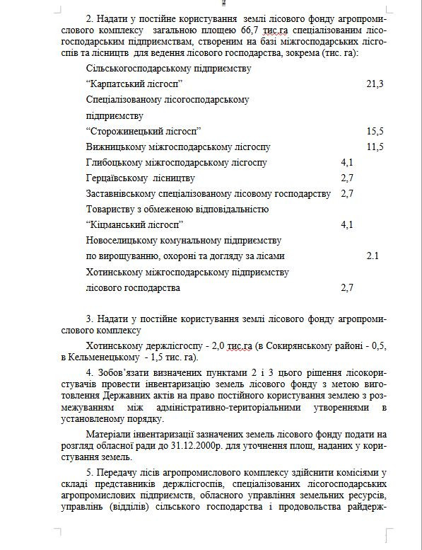 Краще вже читайте статті журналістів. Я неодноразово публікувала рішення Чернівецької обласної ради 2000, 01, 03 років і наголошувала, що обласна рада не передавала новоствореним лісгоспам АПК окремі ділянки, тим більше з кадастровими номерами. Передавали земельні масиви в загальних цифрах гектарів (причому в кожному рішенні — різні цифри у бік зменшення, землі десь «розчинялися») без будь-якої ідентифікації навіть за місцем їх розташування (див прикріплений файл). Тому земельна ділянка у 1,6914 га з зазначеним у прокурорському листі кадастровим номером (присвоєним, до речі, завдяки Кам’янецькій сільраді) ніяк не могла бути передана рішенням облради у 2001 році Глибоцькому держспецлісгоспу. Це фантазії Василя Гончара, які наші прокурори, курам на сміх, сприймають за чисту монету.