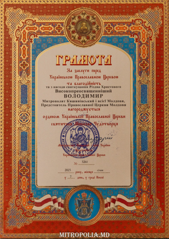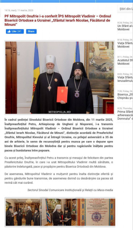 Також на одній зі світлин скриншот із сайту Кишинівської єпархії про нагородження Кантаряна орденом від Онуфрія (указ Онуфрій виписав у січні 2025 р., а вручили – в березні 2025 р.)