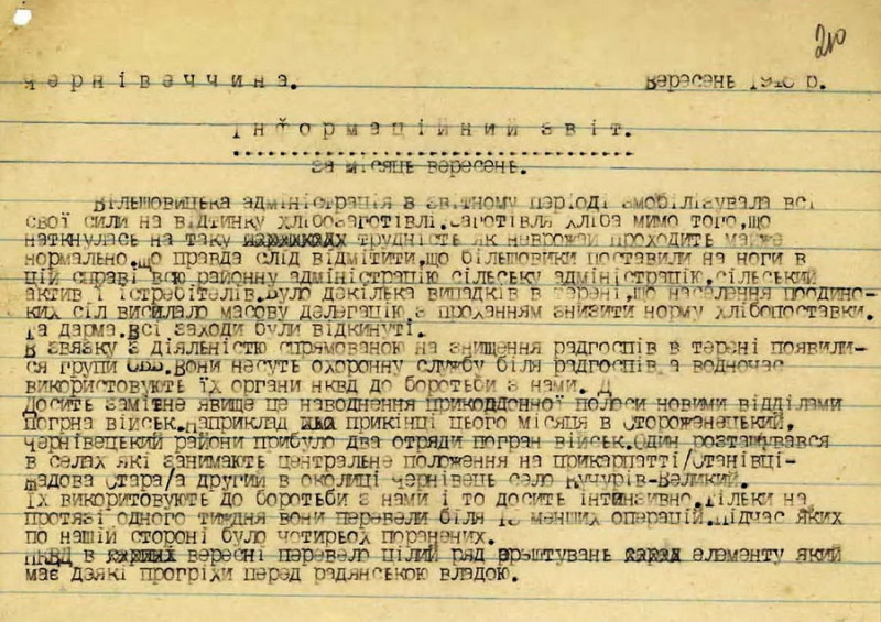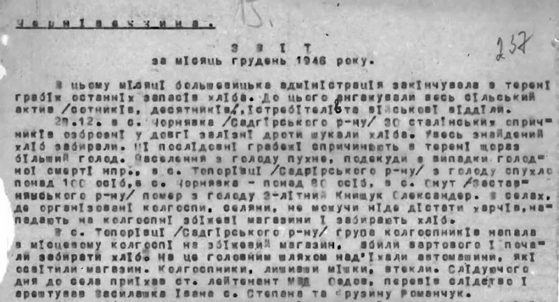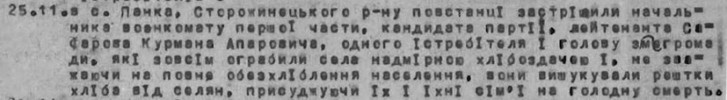 Ці послідовні грабежі спричинюють в терені щораз більший голод. Населення з голоду пухне, подекуди є випадки голодної смерті, н[а]пр[иклад], в с. Топорівці (Садгірського р-ну) з голоду спухло понад 100 осіб, в с. Чорнівка – понад 80 осіб, в с. Онут (Заставнянського р-ну) помер з голоду 3-літний Книщук Олександер. В селах, де організовані колгоспи, селяни, не можучи ніде дістати харчів, нападають на колгоспні збіжеві магазини і забирають хліб.