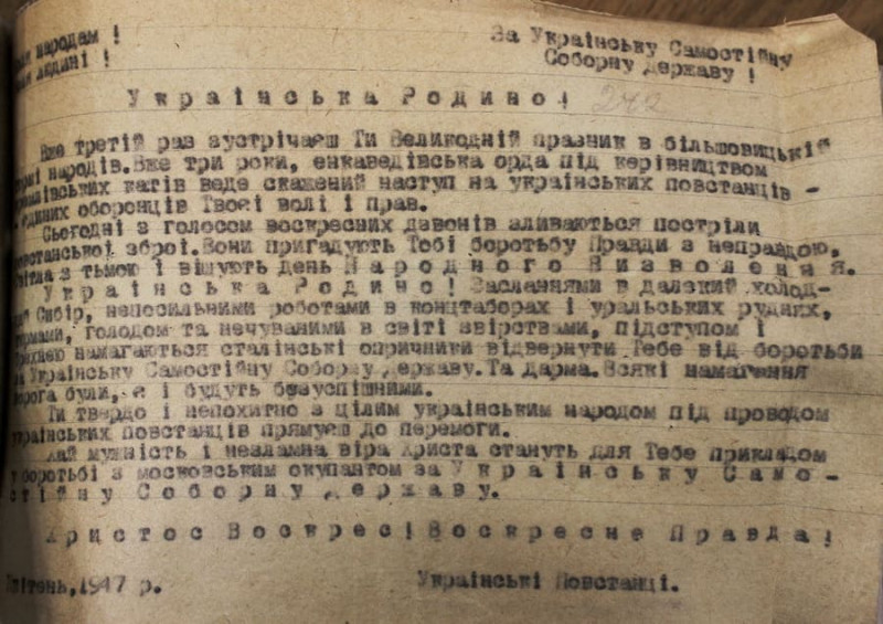 «Брати селяни! Заздалегідь приготовляйте сховки на хліб. Бо московсько-більшовицькі грабіжники цього року будуть Вас обкрадати більше чим торік. Якщо Ви зараз після жнив не заховаєте зерна – будете голодувати. Тільки старанно приготовлені зернові сховки і добре захований в них хліб – врятують вас від голоду. Не допустіть до того, щоб Ваші сім’ї голодували. Ви відповідаєте за їхнє життя перед Богом і Нацією. Знищуйте по сільрадах списки Вашої землі. Знищуйте хлібоздачні книги. Цим утрудните московсько-більшовицьким злодіям їхній злочинний грабіж. Липень 1947 р. Українські повстанці».