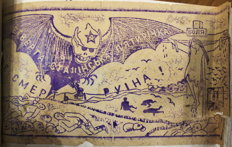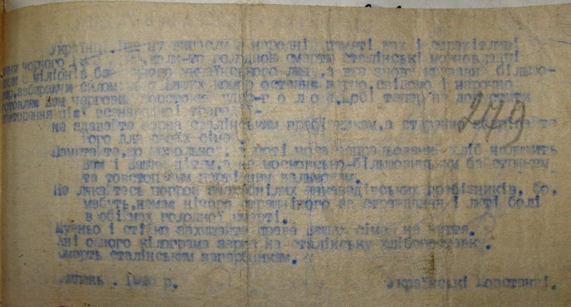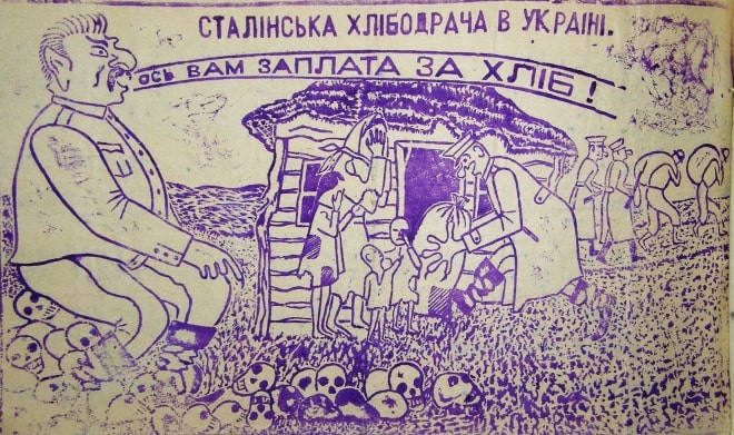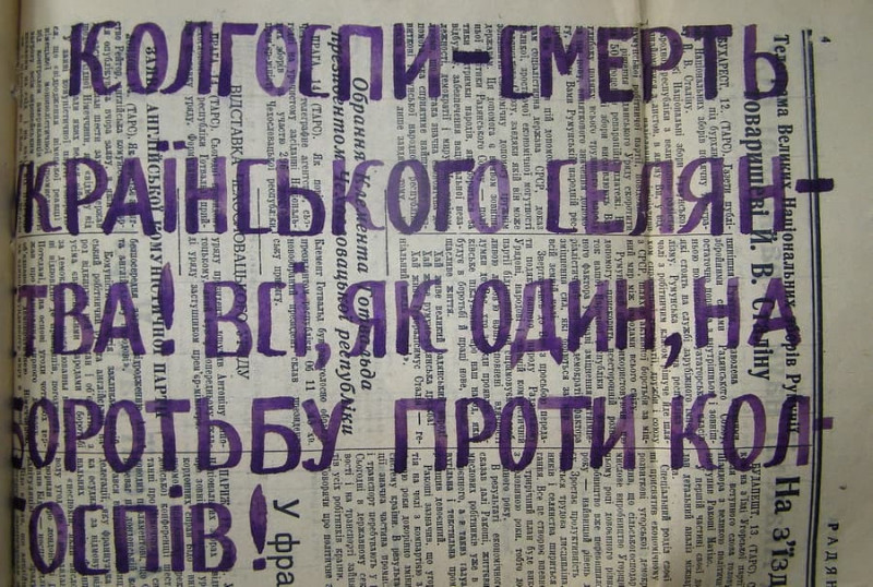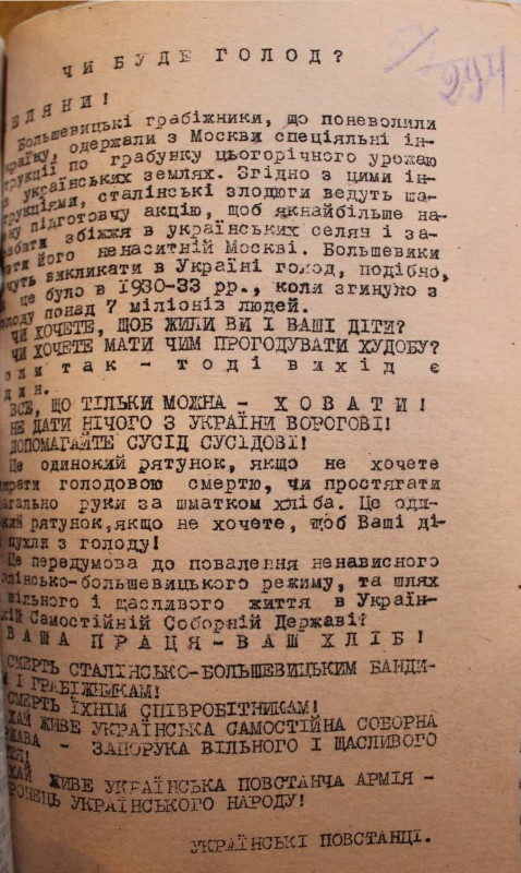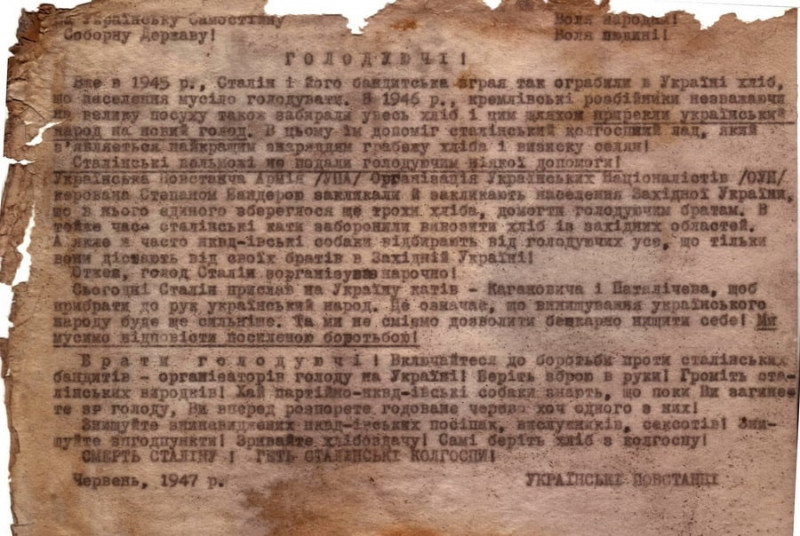 “Селяни! Не давайте жодного літру молока, жодного кілограма м’яса, а нагодуйте своїх голодних батьків та дітей. Смерть сталінським експлуататорам!”