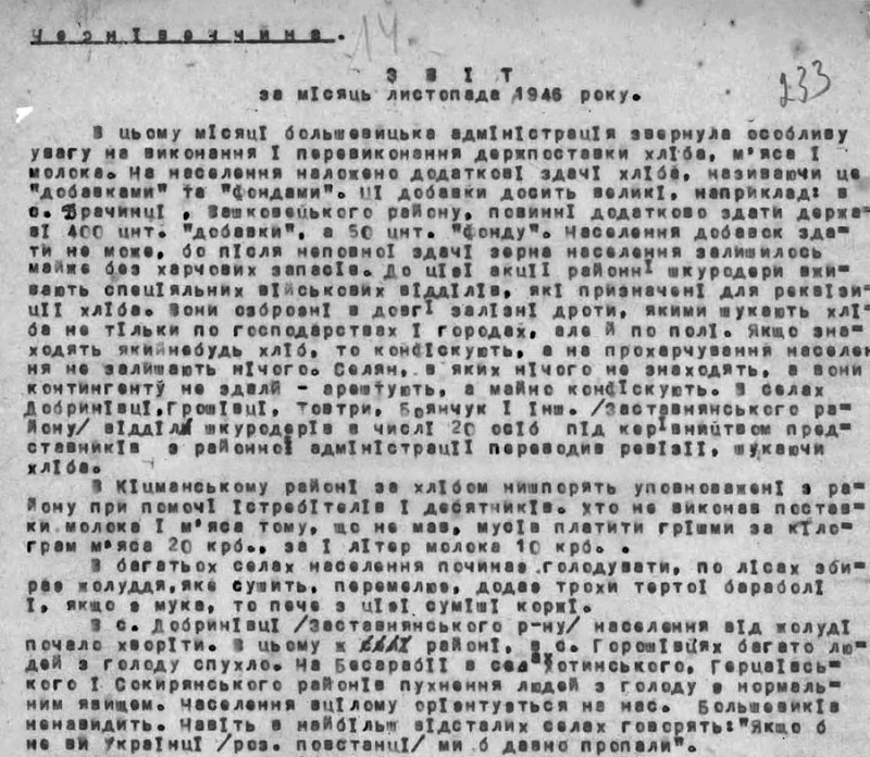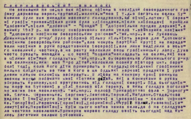 «Незважаючи на це, що вже пізною осінню, внаслідок безсердечного грабежу державою зерна, картоплі, молока, м’яса і т. д., в багатьох селах Буковини були вже випадки масового голодування, в січні, лютому і березні грабіж тривав. Після жнив була хлібоздача, після хлібоздачі прийшли “добавки”, після “добавок” – “фонди” і “добровільна продаж державі”, а взимку 1947 р. на спину ожебрачених селян упала т. зв. “позика насіння” і “допомога насінням бесарабським районам”. Досвідчені грабіжники пильно слідкують за тим, в кого є ще будь-які харчові продукти і урядовим шляхом силоміць забирають. В лісах на кожному кроці ранньою весною, можна побачити живі кістяки дітей, які з кошиками в руках збирають кропиву, щоб врятуватись від голодної смерті. Під сьогоднішню пору на Буковині є цілі полоси сіл терену, в яких голодує поголовно майже все населення. Так, наприклад, полоса Прикарпаття: села – Чорногузи, Багна, Черешенька, Бергомет, Левкова, Парцелі, Майдани, Стара, Нова Жадова і інші. Друга смуга на узграниччі з Бесарабією: села – Чорновка, Топорівці, Раранча, Горошівці, Добринівці, Кучурів Малий, Ржавинці, Баламутівка, Перебиківці. Крім цього, майже немає села, де б не голодувала частина населення. Примарне марево голоду стоїть сьогодні над колись багатими селами Буковини».