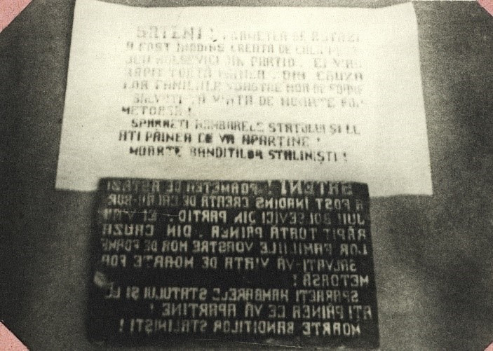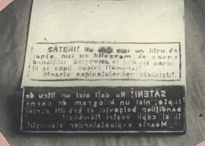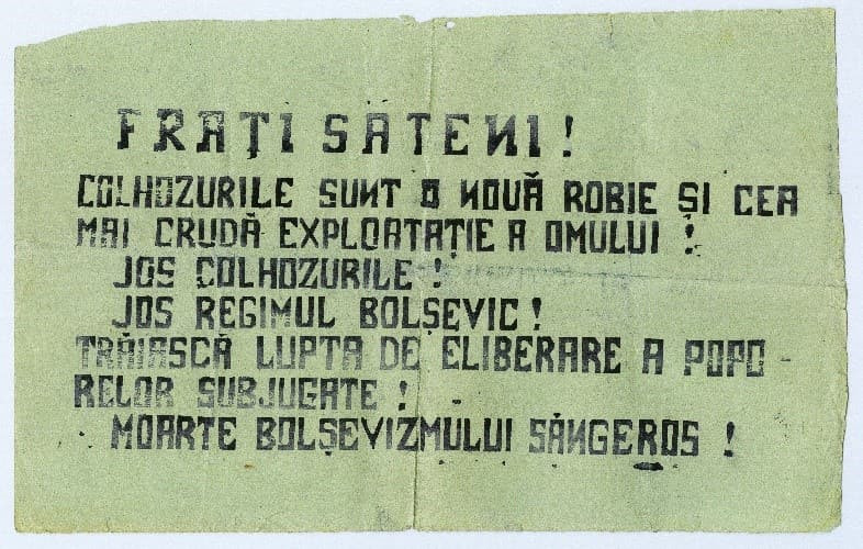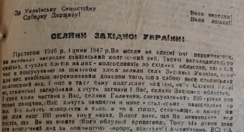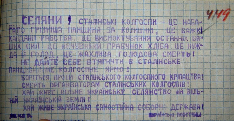 «Шановні жителі села! Колгоспи – це нове рабство, найжорстокіша експлуатація людини. Геть колгоспи! Геть більшовицький режим! Нехай живе боротьба за визволення підкорених народів! Смерть кривавому більшовизму!»