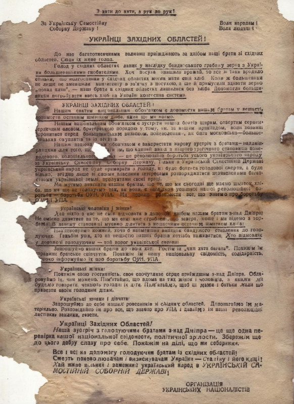 «Українці! Іще не випали з народної пам’яті жах і страхітливі картини чорного 1933 року, коли-то голодною смертю сталінські можновладці знищили 6 міліонів безвинного українського люду, а вже знову більшовики, забираючи силоміць з ваших комор останнє зерно, свідомо і нарочно приготовляє вам черговий жорстокий удар – г о л о д! Щоб тепер не допустити повторення цієї всенародної трагедії –