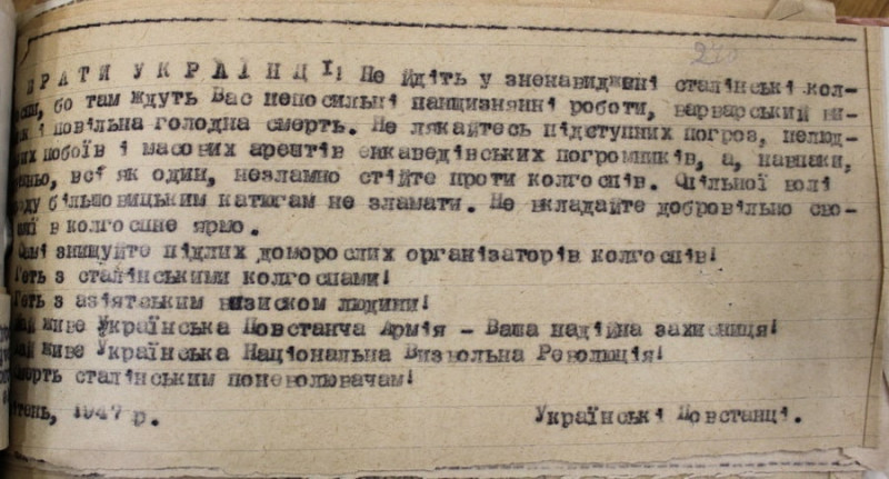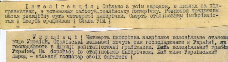 «Останнім часом ОУНівське підпілля видало і поширює в низці сіл районів області агітацію шляхом розкидання націоналістичних листівок, зміст яких зводиться до заклику місцевого населення не вступати до колгоспів і зривати план четвертої Сталінської п’ятирічки».