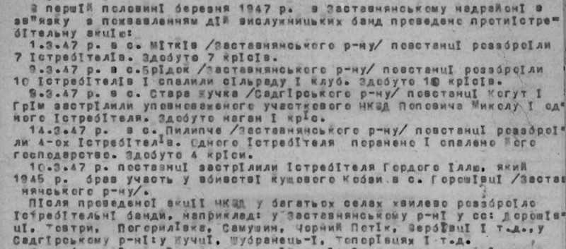 7 березня 1947 року в 22.00 в селі Шубранець Садгірського району істребками виявлено і підібрано 55 оунівських листівок.