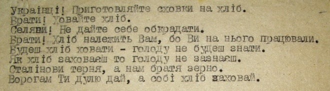 “Жителі села. Сьогоднішній голод навмисно створили більшовицькі кати партії. Вони забрали весь хліб. Через них ваші сім’ї голодують. Рятуйте життя від голодної смерті. Розбийте комори держави і візьміть хліб, який вам належить. Смерть сталінським бандитам!”