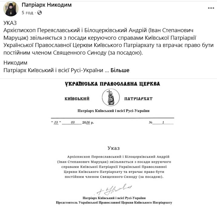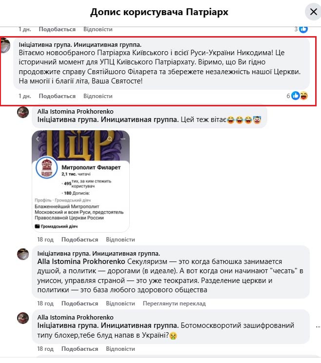А вже на Facebook-сторінці владики Никодима «Ініціативна група» вперше засвітилася 22 березня, опублікувавши привітання з «обранням» патріархом.