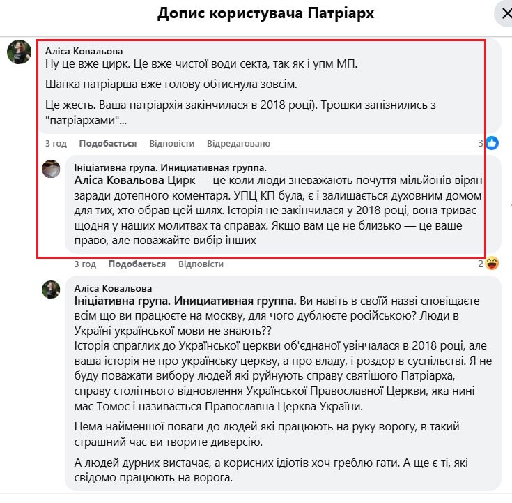 23 березня спільнота оперативно реагувала на критичні коментарі, які лилися під дописами Никодима. Наприклад, на зауваження користувачки Аліси Ковальової, яка написала, що УПЦ КП такими діями «перетворилася на секту», поборники Никодима з «Ініціативної групи» ввічливо пояснювали: мовляв, треба поважати вибір інших вірян, а історія УПЦ КП продовжується.