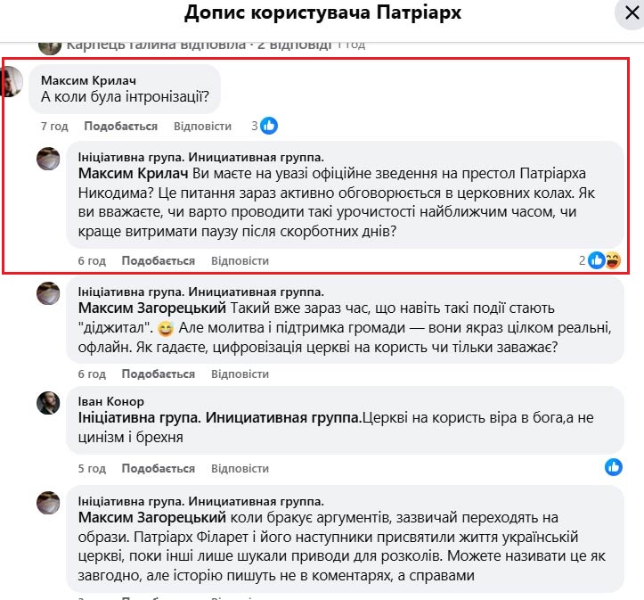 Окрему полеміку «Ініціативна група» розвела щодо дати інтронізації (посвячення на найвищу посаду) Никодима. Зокрема, спільнота радилася з Максимом Крилачем, який залишив коментар, коли краще провести цей урочистий захід – найближчим часом чи дочекатися, коли минуть 40 днів після смерті Філарета?