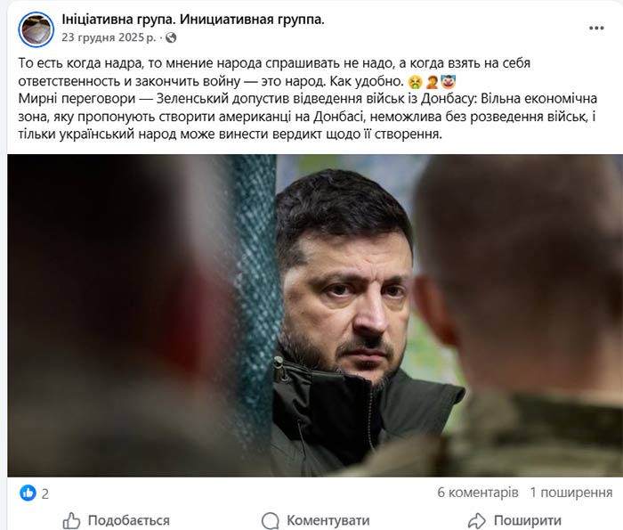 Під час вторгнення зміст більшості публікацій «Ініціативної групи» на її сторінці у Facebook був все більш схожим до російської пропаганди. Наприклад, 23 грудня 2025 року автори спільноти звинуватили у відсутності миру в країні… президента Володимира Зеленського.