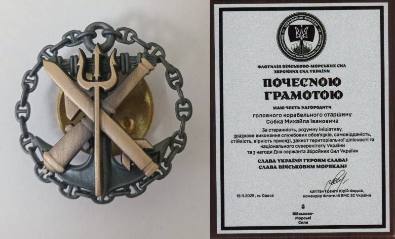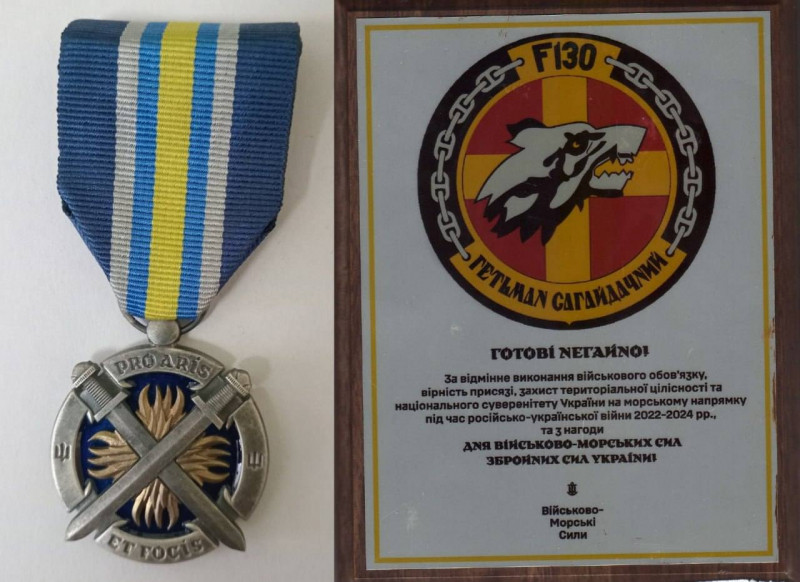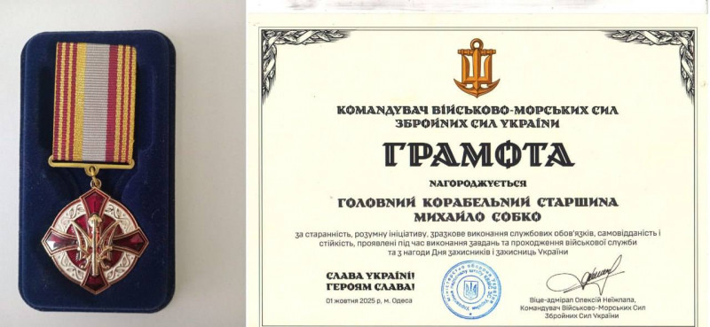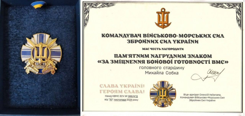 Це нагрудний знак «За зміцнення бойової готовності ВМС ЗС України», нагрудний знак Головнокомандувача за сумлінну службу, почесні грамоти та медалі від командування Військово-Морських Сил ЗСУ – за старанність, розумну ініціативу, зразкове виконання службових обов’язків, самовідданість і стійкість, захист територіальної цілісності та національного суверенітету України.