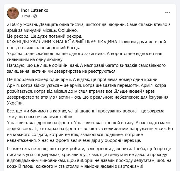 “У нас вистачає дронів на фронті. У нас вистачає грошей в тилу. У нас надто мало людей воює. Ті, хто зараз на фронті – воюють з величезним напруженням сил, бо на кожного солдата, котрий не втік, звалюється подвійне, потрійне навантаження. У нас на фронті величезні діри у обороні через це”, – пише Луценко.