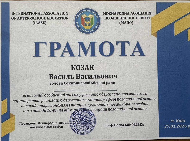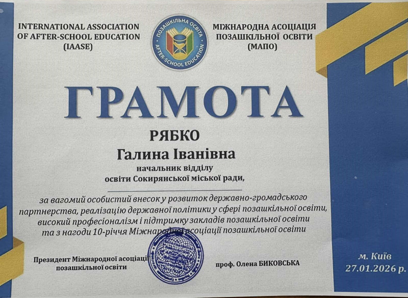 За вагомий внесок у збереження та розвиток позашкільної освіти у громаді відзнаками Міжнародної асоціації позашкільної освіти нагороджено голову Сокирянської міської громади Василя Козака, начальника відділу освіти Галину Рябко та керівника КЗ «Школа мистецтв ім. Михайла Мафтуляка» Наталію Кулій.