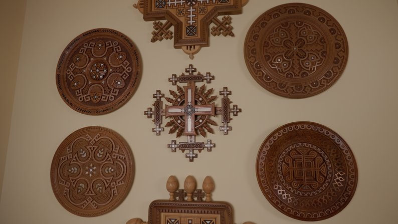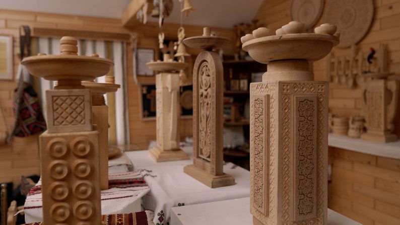 Серед робіт майстра є багато оберегів, які і прикрашають, і оберігають дім. Він показує один з перших свічників, який виготовив у 2007 році. За різьбою можна побачити, що тоді менше експериментував. Зараз же поєднує інкрустацію бісером, металом, перламутром.