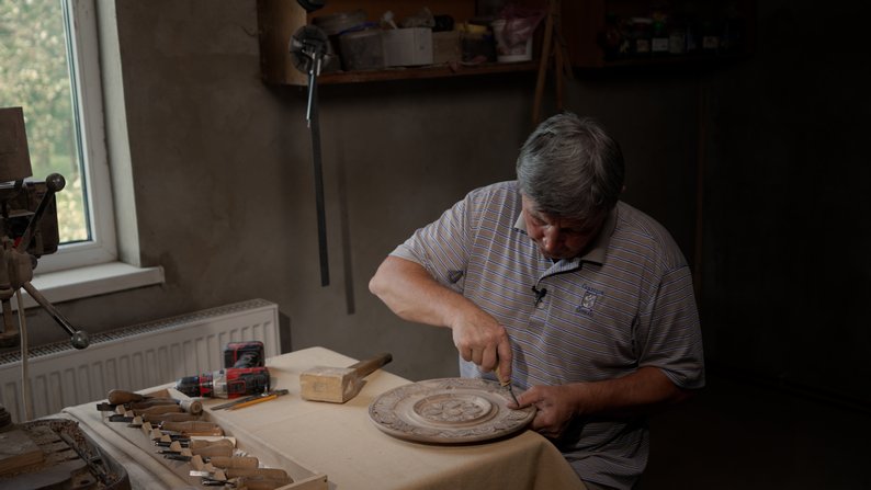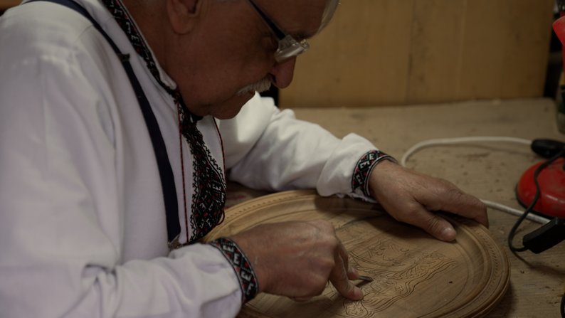 Різьбяр взявся доробляти тарілку. Таку вже колись виготовляв у Канаду. Зображує запорізького козака на коні. Вмикає світильник, одягає окуляри, бере різець і починає утворювати композицію. Робить це повільно. Після кількох рухів оглядає результат. Відтак бере новий різець і так доповнюється образ.
