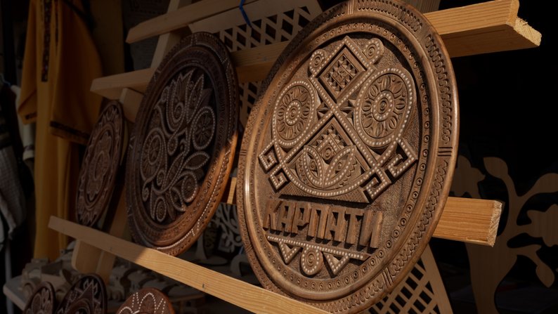 Деревʼяні тарілки, які майстер Володимир Запорожець продає на ринку у Косові. Суспільне Чернівці