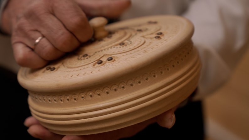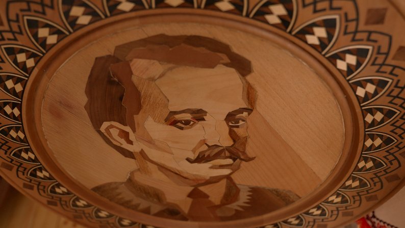 Трохи проходить далі по світлиці. Показує рахву – таку ємкість, у якій тримають бринзу. Вона злегка оздоблена, зі спеціальною кришкою. Потім показує вже деревʼяну миску, у яку, за його словами, збирали гроші на весіллі. Серед виробів є й інкрустована тарілка, на якій зображений Юрій Федькович. Таку роботу майстер створив орієнтовно за три тижні.