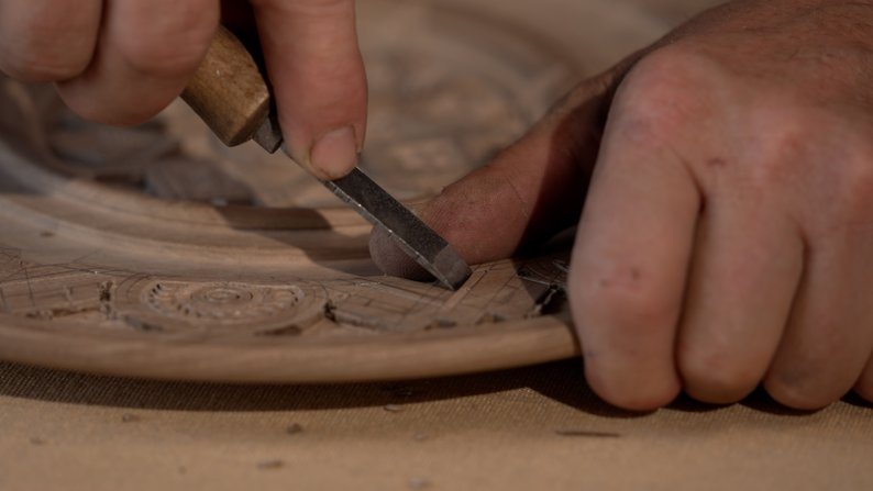 За допомогою спеціальних різців майстер утворює візерунки, як відчуває саме в цьому моменті. В роботі він – інша людина, яка знає свою справу, яка може це робити годинами і не стомлюватися, яка хоче експериментувати і яка готова говорити про це ремесло вічність.