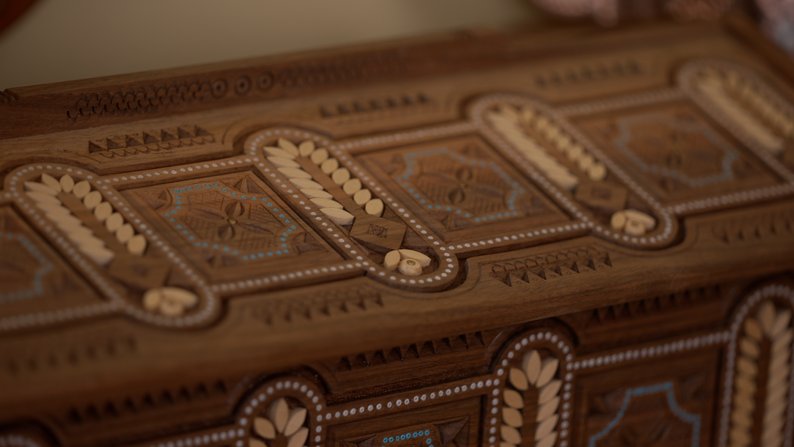 Скринька, яку бере до рук, – вже інший підхід. Тут кілька порід дерева й через це вона видається обʼємною і ніби помальованою. Каже, виготовив за сотню годин і це для такої величенької роботи було швидко. А ось найдовше створював двері у капличку. Разом з трьома іншими майстрами за пів року зробили інкрустацію перламутром, червоним деревом та моржовою кісткою.