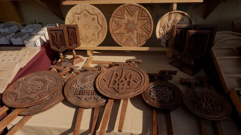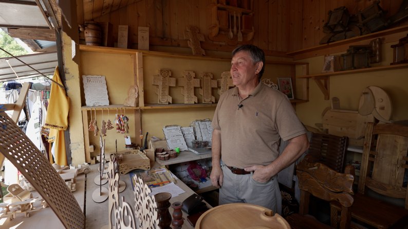 Володимир не просто продає, аби продати. Кожному має розповісти про особливості різьби, вкладені сенси. Як сонце починає припікати, поправляє свої вироби та переставляє їх місцями – так турбується про їх вигляд та якість. Жвавіше біля його прилавку стає від 10 й до 12 години.