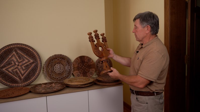 Колекція різьбяра Володимира Запорожця, Чорногузи, 2025 рік. Суспільне Чернівці"Це твори мистецтва, а не сувенірна продукція, яку я продаю на ринку. На такі тарілки з колекції потрібно у 15 разів більше часу, ніж на сувенір. Завжди любуюся, показую друзям, бо це для душі".