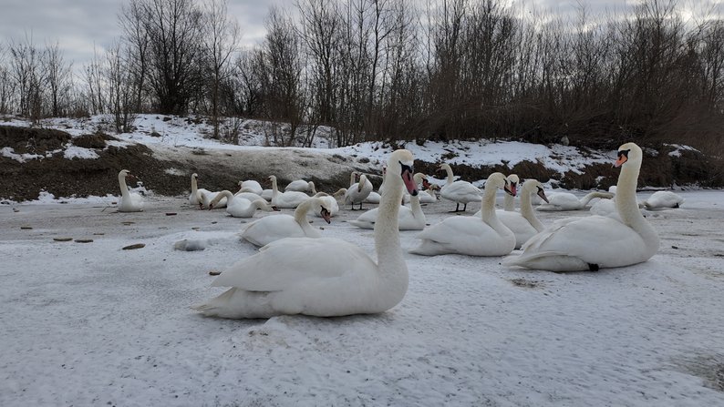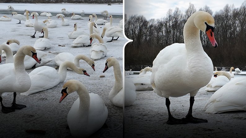 "Їх дуже багато, раніше такої кількості не було. Спочатку було 36 птахів, потім я пішов додому, взяв кукурудзу з пшеницею і приніс, щоб їх підгодувати. На другий день їх уже було більше ста. Також повідомив сусідів, щоб за можливості приносили зерно лебедям", – каже Дмитро.