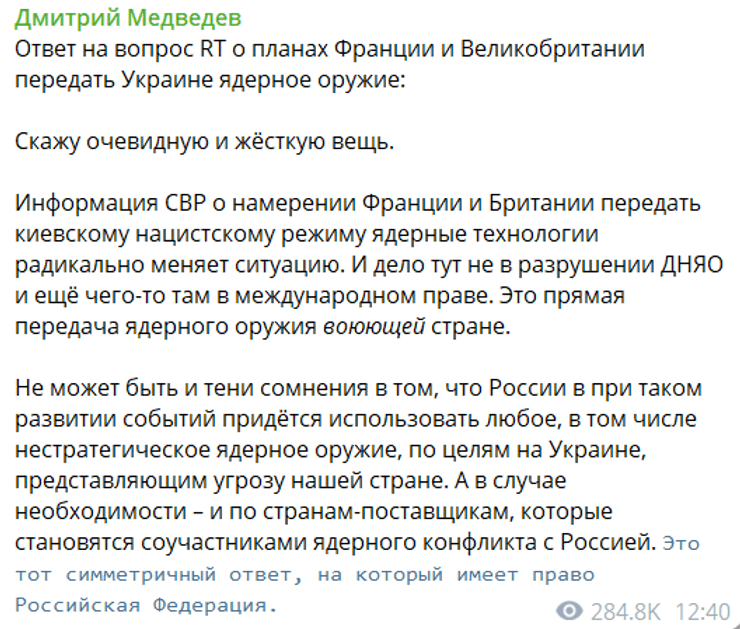 Після того, як Служба зовнішньої розвідки Російської Федерації раптово заговорила про те, що Великобританія і Франція нібито активно працюють над вирішенням питань надання Україні ядерної зброї та засобів її доставки, Медведєв тут же відзначився новим скандальним постом у соцмережах, заявивши, що РФ має право на “симетричну відповідь”, пише Фокус.