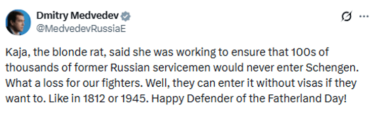 Напередодні політик відзначився ще однією погрозою. Після того, як 23 лютого перед засіданням Ради ЄС із закордонних справ у Брюсселі глава європейської дипломатії Кая Каллас заявила, що Європейський союз працює над обмеженням в’їзду колишнім російським військовослужбовцям до Шенгенської зони, Медведєв залишив на Х образливе послання для неї.