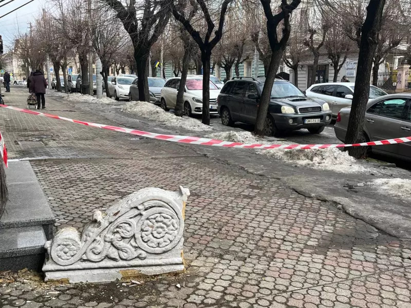 Біля обваленого балкона розчищають тротуар для безпечного проходу пішоходів. Суспільне Чернівці