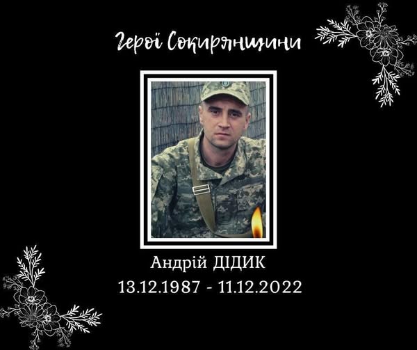 Лейтенант Андрій Дідик загинув у грудні 2022 року на Бахмутському напрямку, виконуючи бойове завдання та захищаючи українську землю.