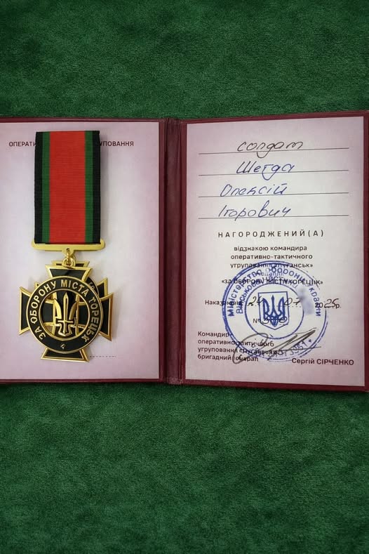 Військовослужбовець із одного з населених пунктів Сокирянської громади отримав відзнаку командира оперативно-тактичного угрупування «Луганськ» – медаль «За оборону міста Торецьк».